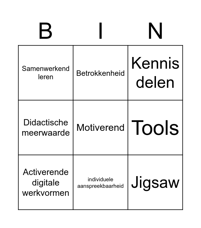 This bingo card has 9 words: Activerende digitale werkvormen, Motiverend, Kennis delen, Samenwerkend leren, Betrokkenheid, Tools, Didactische meerwaarde, individuele aanspreekbaarheid and Jigsaw.