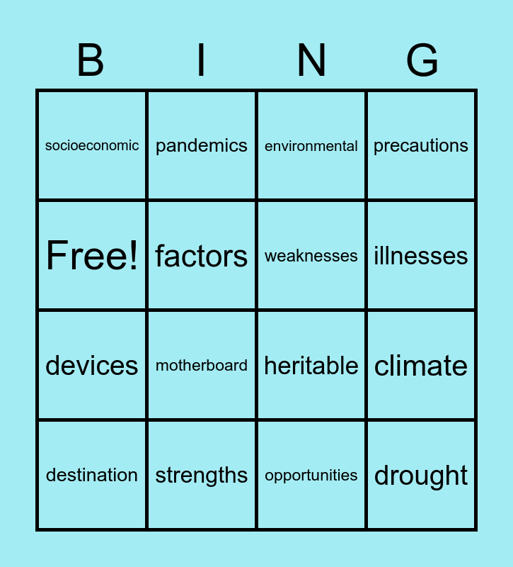 This bingo card has 16 words: strengths, climate, environmental, socioeconomic, devices, pandemics, heritable, opportunities, Free!, factors, destination, precautions, motherboard, illnesses, weaknesses and drought.