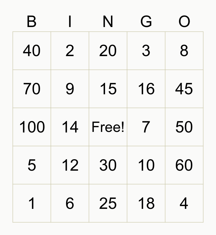 This bingo card has a free space and 24 words: 1, 12, 15, 18, 8, 40, 2, 20, 7, 50, 100, 9, 10, 60, 70, 6, 25, 3, 45, 5, 14, 30, 16 and 4.