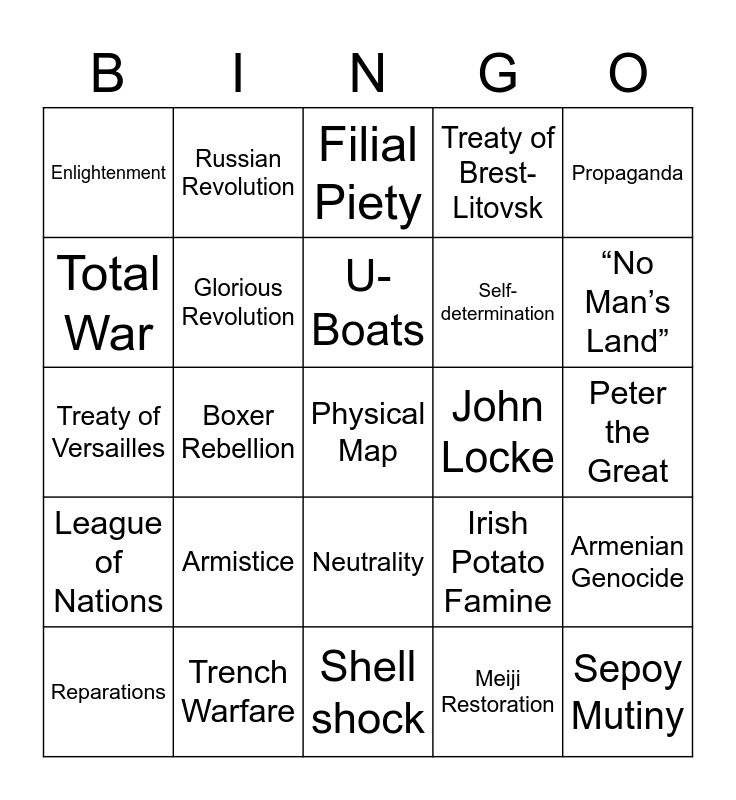 This bingo card has 31 words: Shell shock, Blood & Iron, Boxer Rebellion, Cultural Diffusion, Enlightenment, Filial Piety, Glorious Revolution, Irish Potato Famine, John Locke, Meiji Restoration, Peter the Great, Physical Map, Sepoy Mutiny, Westernization, “No Man’s Land”, “Powder Keg” of Europe, Armenian Genocide, Armistice, League of Nations, Neutrality, Propaganda, Rationing, Reparations, Russian Revolution, Self-determination, Total War, Treaty of Brest-Litovsk, Treaty of Versailles, Trench Warfare, U-Boats and Unrestricted Submarine Warfare.