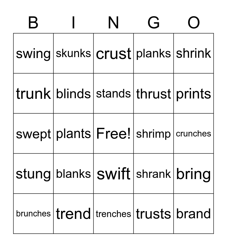 This bingo card has a free space and 24 words: blanks, trend, stands, brunches, shrink, swing, trunk, skunks, shrimp, swift, thrust, swept, shrank, bring, blinds, trusts, crunches, crust, prints, plants, brand, stung, planks and trenches.