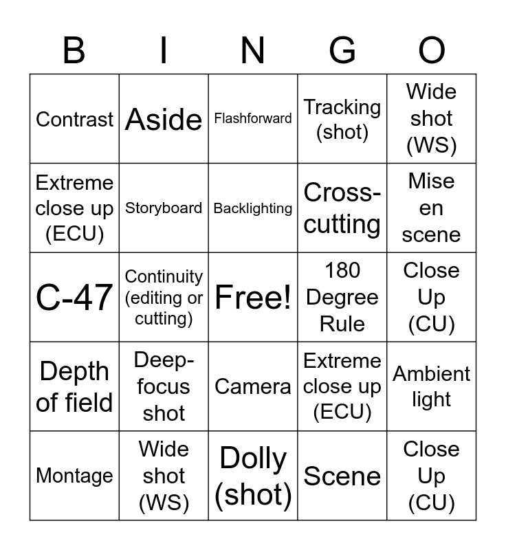 This bingo card has a free space and 63 words: 180 Degree Rule, Act, Aerial Shot, Ambient light, camera angle, Aperture, Aside, Aspect Ratio, Backlighting, Beat, Camera, Character, Close Up (CU), Wide shot (WS), Medium shot (MS), Extreme close up (ECU), Continuity (editing or cutting), Contrast, Coverage, Cross-cutting, Deep-focus shot, Depth of field, Tracking (shot), Dolly (shot), Pan, Tilt, Ellipsis, Flashback, Flashforward, Fourth Wall, Frame, Insert shot, Jump cut, Juxtaposition, Mise en scene, Montage, Reaction shot, Scene, Zolly (shot), Storyboard, C-47, 180 Degree Rule, Aerial Shot, Aspect Ratio, Close Up (CU), Wide shot (WS), Medium shot (MS), Extreme close up (ECU), Continuity (editing or cutting), Cross-cutting, Tracking (shot), Dolly (shot), Pan, Tilt, Flashback, Flashforward, Insert shot, Jump cut, Juxtaposition, Mise en scene, Reaction shot, Zolly (shot) and C-47.