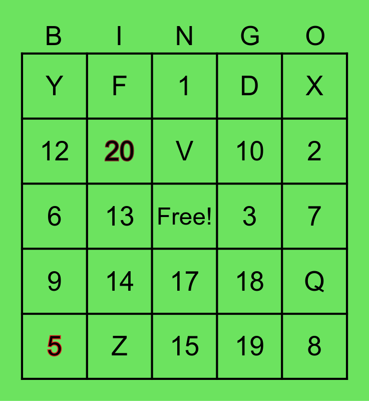 This bingo card has a free space and 29 words: 5, E, 13, 16, Y, 1, 20, 14, 3, Z, 7, 8, 15, 19, 2, 4, 17, 9, X, 6, 18, 11, 10, 12, D, F, Q, V and J.