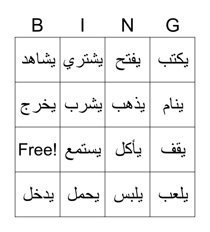 This bingo card has 20 words: يقف, يجلس, يفتح, يقرأ, يدخل, يخرج, يحمل, يشاهد, Free!, يشتري, يستمع, يأكل, يشرب, يلعب, يذهب, يرتب, ينام, يكتب, يلبس and يركب.