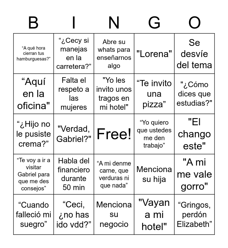 This bingo card has a free space and 28 words: "A mi me vale gorro", "¿Verdad Arantxa?", “Te invito una pizza”, "Vayan a mi hotel", “Aquí en la oficina", Abre su whats para enseñarnos algo, “¿Cecy si manejas en la carretera?”, “Te voy a ir a visitar Gabriel para que me des consejos”, “Yo quiero que ustedes me den trabajo”, “Cuando falleció mi suegro”, “¿Hijo no le pusiste crema?”, "Lorena", “Ceci, ¿no has ido vdd?”, Menciona su negocio, "¿Cómo dices que estudias?", “Ahorita estoy en la terraza”, Habla del financiero durante 50 min, Falta el respeto a las mujeres, "Yo les invito unos tragos en mi hotel", “A mi denme carne, que verduras ni que nada”, “A qué hora cierran tus hamburguesas?”, "Viviana, a cuanto das las copias en tu papelería?", “Gringos, perdón Elizabeth”, "Verdad, Gabriel?", "El chango este", Menciona su hija, Se desvíe del tema and Cuenta un anécdota de un viaje.