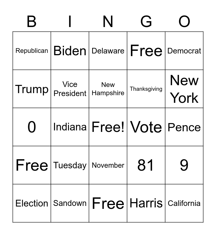 This bingo card has a free space and 24 words: Tuesday, Sandown, New Hampshire, Election, Democrat, Republican, Trump, Biden, Vote, November, Thanksgiving, 0, 81, 9, Vice President, Harris, Pence, Delaware, New York, Indiana, California, Free, Free and Free.