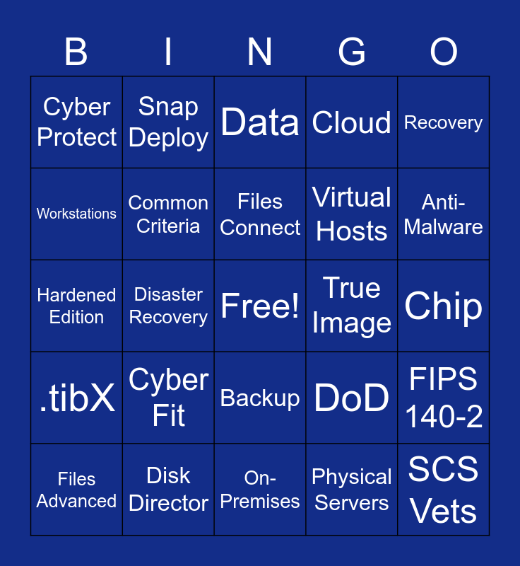 This bingo card has a free space and 24 words: Cyber Fit, Disk Director, Files Connect, Files Advanced, Recovery, Cyber Protect, Workstations, Snap Deploy, True Image, Backup, Virtual Hosts, Hardened Edition, DoD, FIPS 140-2, Common Criteria, Physical Servers, Chip, Data, Anti-Malware, Disaster Recovery, SCS Vets, .tibX, Cloud and On-Premises.