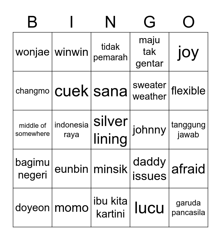 This bingo card has a free space and 24 words: eunbin, momo, sana, doyeon, joy, wonjae, changmo, winwin, johnny, minsik, sweater weather, middle of somewhere, daddy issues, afraid, cuek, lucu, tanggung jawab, tidak pemarah, flexible, indonesia raya, garuda pancasila, bagimu negeri, maju tak gentar and ibu kita kartini.