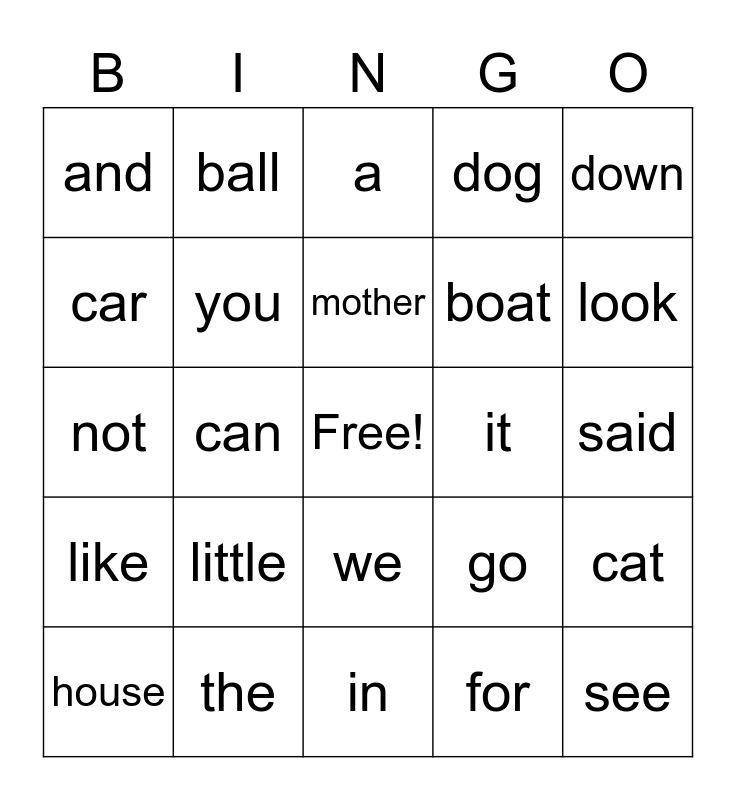 This bingo card has a free space and 30 words: the, I, can, to, and, a, you, we, it, in, said, see, for, up, look, is, go, like, little, down, not, of, ball, boat, car, dog, cat, house, mother and father.