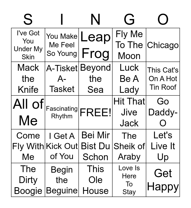 This bingo card has a free space and 40 words: Ain't That A Kick In The Head, All of Me, As Long As I'm Singing, A-Tisket A-Tasket, Begin the Beguine, Bei Mir Bist Du Schon, Beyond the Sea, Blue Skies, Chicago, Come Fly With Me, Fascinating Rhythm, Fly Me To The Moon, Get Happy, Go Daddy-O, Hit That Jive Jack, I Get A Kick Out of You, I'm Just A Gigolo, I've Got You Under My Skin, Jump Jive An' Wail, Leap Frog, Let's Live It Up, Love Is Here To Stay, Luck Be A Lady, Mack the Knife, My Blue Heaven, Nice 'N' Easy, Oh You Beautiful Doll, Saturday Night, Sweet Georgia Brown, Swing Brother Swing, The Charleston, The Dirty Boogie, The Lady Is A Tramp, The Sheik of Araby, This Cat's On A Hot Tin Roof, This Ole House, We're In The Money, When You're Smiling, You Make Me Feel So Young and Zoot Suit Riot.