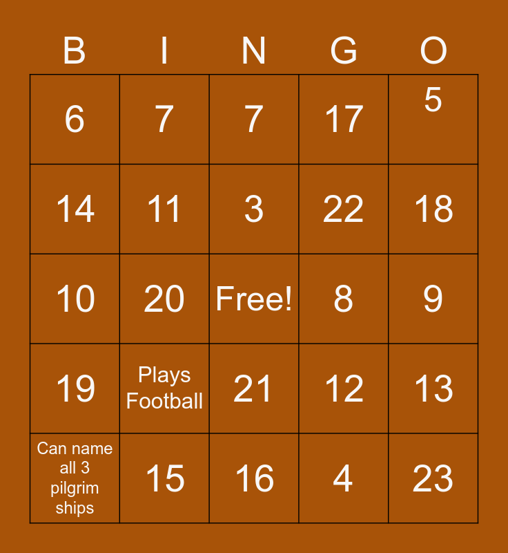 This bingo card has a free space and 24 words: Can name all 3 pilgrim ships, Plays Football, 3, 4, 5, 6, 7, 7, 8, 9, 10, 11, 12, 13, 14, 15, 16, 17, 18, 19, 20, 21, 22 and 23.