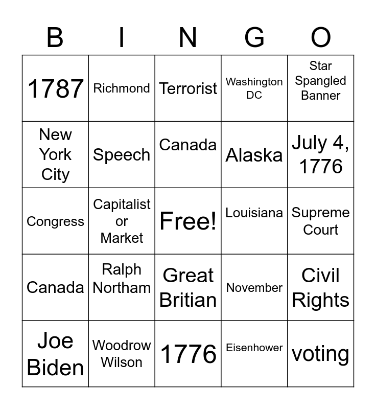 This bingo card has a free space and 50 words: Life, Liberty, voting, Constitution, 1776, Ralph Northam, Slavery, Richmond, Jefferson, New York City, Atlantic Ocean, Speech, Washington DC, Civil Rights, November, Rule of Law, 50, Canada, Louisiana, Mississippi, Star Spangled Banner, Capitalist or Market, Eisenhower, 1787, Alaska, We the people, The Star Spangled Banner, July 4, 1776, John Roberts, Terrorist, Great Britian, Susan B. Anthony, Franklin Roosevelt, Louisiana, George Washington, Woodrow Wilson, Africa, Japan,Germany,Italy, Citizenship, President Cabinet, Supreme Court, Provide Schooling, Selective Services, 435, Print Money, Joe Biden, Congress, Advises the President, Colonies, Canada and Vote.