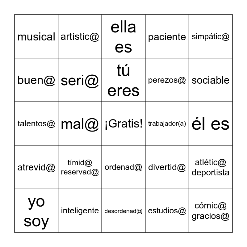 This bingo card has a free space and 24 words: tímid@ reservad@, inteligente, tú eres, yo soy, simpátic@, musical, buen@, artístic@, trabajador(a), ordenad@, perezos@, talentos@, divertid@, atlétic@ deportista, seri@, estudios@, él es, ella es, sociable, mal@, cómic@ gracios@, atrevid@, paciente and desordenad@.