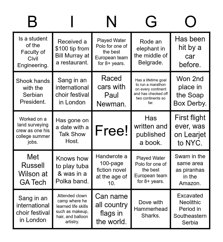 This bingo card has a free space and 51 words: Recorded his first studio song at 13 years old., Excavated Neolithic Period in Southeastern Serbia, Had to sneak out of his own prom party., Can name all country flags in the world., Knows how to play tuba & was in a Polka band., Hates Sunny Beaches, Received a $100 tip from Bill Murray at a restaurant., Won 2nd place in the Soap Box Derby., Shook hands with the Serbian President., Jumped out of a moving train., Sang in an international choir festival in London, Rode an elephant in the middle of Belgrade., Swam in the same area as piranhas in the Amazon., Played Water Polo for one of the best European team for 8+ years., Went to GA Tech on a Full Ride Scholarship., Led a Protest March of student to the Principal's Office in the middle of the night., Raced cars with Paul Newman., Has written and published a book., Used to be a sponsored wakeboarder., Has been hit by a car before., Has gone on a date with a Talk Show Host., Dove with Hammerhead Sharks., Is a student of the Faculty of Civil Engineering., Has a lifetime goal to run a marathon on every continent and has checked off two continents so far., Hates Sunny Beaches, Received a $100 tip from Bill Murray at a restaurant., Won 2nd place in the Soap Box Derby., Shook hands with the Serbian President., Sang in an international choir festival in London, Played Water Polo for one of the best European team for 8+ years., Has been hit by a car before., Broke the speed limit in a supercar, in the middle of Paris., Traveled every month last year., Once ran in a hurricane., Has gone paragliding in Switzerland., Attended clown camp where he learned life skills such as makeup, hair, and balloon artistry., Hung out with Matt Ryan on the sidelines., Lost 3 year old on a beach, when he wandered off down the beach sans parents. Little one was returned 30 minutes later by a nice mom., Sat next to Muhammad Ali at dinner., Has visited Every distillery in the Islay region except 1., First flight ever, was on Learjet to NYC., Met Russell Wilson at GA Tech, Eats mustard on his avocado toast and all eggs., Co-authored a book chapter., Co-authored a book chapter., Had a pet chicken growing up named Henny Penny., Worked on a land surveying crew as one his college summer jobs., Won a model car, instead of a real car on Game of Luck., Is a twin, Handwrote a 100-page fiction novel at the age of 10. and Grew up on a farm in Michigan.