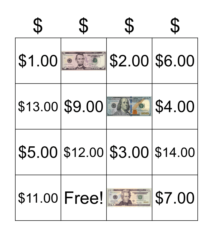 This bingo card has 5 images and 16 words: Free!, $1.00, $2.00, $3.00, $4.00, $5.00, $6.00, $7.00, $8.00, $9.00, $10.00, $11.00, $12.00, $13.00, $14.00 and $15.00.