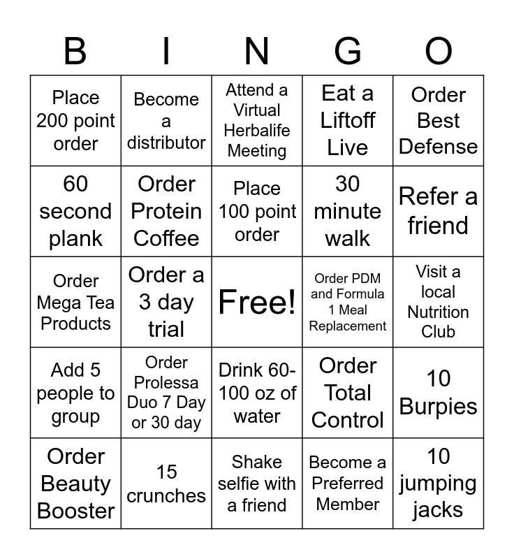 This bingo card has a free space and 24 words: Order Beauty Booster, Order Prolessa Duo 7 Day or 30 day, Place 100 point order, Become a Preferred Member, Order Best Defense, Place 200 point order, Become a distributor, Attend a Virtual Herbalife Meeting, Order PDM and Formula 1 Meal Replacement, Visit a local Nutrition Club, Order Mega Tea Products, Order Protein Coffee, Order Total Control, 10 Burpies, 60 second plank, 15 crunches, Shake selfie with a friend, Eat a Liftoff Live, Refer a friend, Add 5 people to group, Order a 3 day trial, Drink 60-100 oz of water, 30 minute walk and 10 jumping jacks.