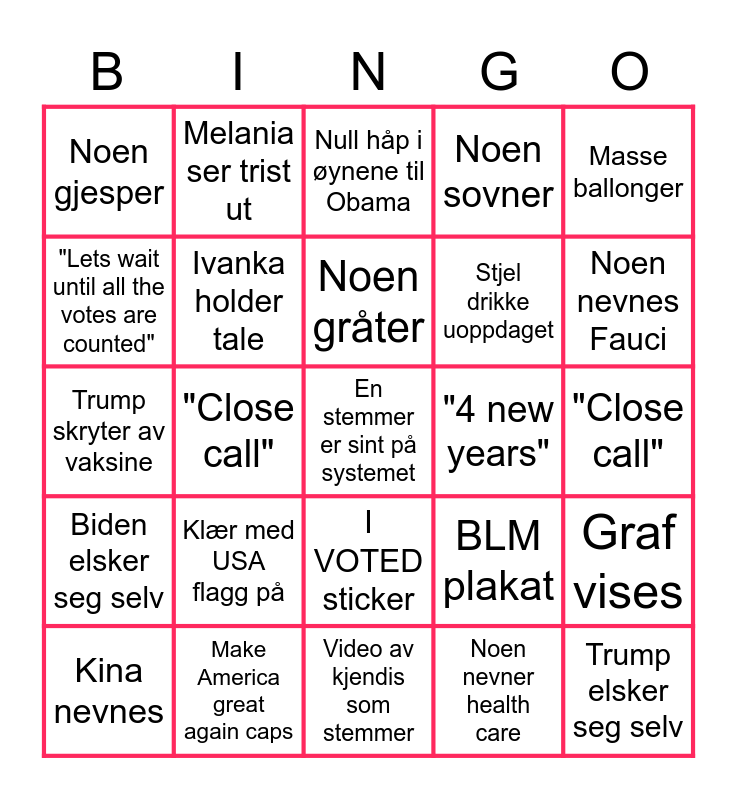 This bingo card has a free space and 24 words: Kina nevnes, Klær med USA flagg på, Noen gråter, Noen nevner health care, Masse ballonger, Noen gjesper, Melania ser trist ut, Null håp i øynene til Obama, "4 new years", "Close call", Trump skryter av vaksine, Ivanka holder tale, BLM plakat, Graf vises, "Lets wait until all the votes are counted", Make America great again caps, Video av kjendis som stemmer, Noen sovner, Noen nevnes Fauci, Biden elsker seg selv, "Close call", I VOTED sticker, Stjel drikke uoppdaget and Trump elsker seg selv.