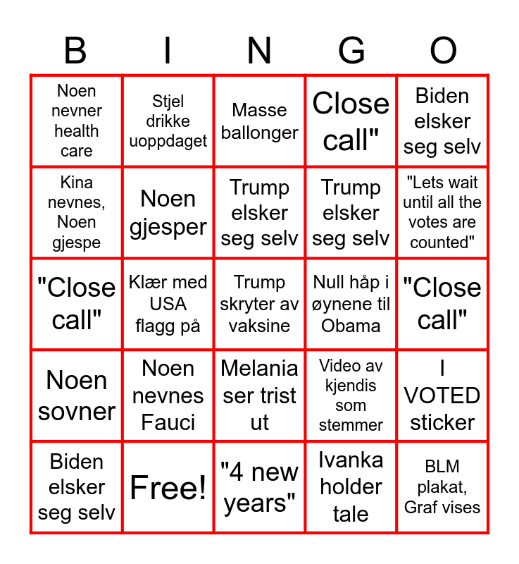 This bingo card has 30 words: Free!, Kina nevnes, Klær med USA flagg på, Noen gråter, Noen nevner health care, Masse ballonger, Noen gjesper, Melania ser trist ut, Null håp i øynene til Obama, "4 new years", "Close call", Trump skryter av vaksine, Ivanka holder tale, BLM plakat, Graf vises, "Lets wait until all the votes are counted", Make America great again caps, Video av kjendis som stemmer, Noen sovner, Noen nevnes Fauci, Biden elsker seg selv, "Close call", I VOTED sticker, Stjel drikke uoppdaget, Trump elsker seg selv, Kina nevnes, Noen gjespe, Close call", I VOTED sticker, Biden elsker seg selv, Trump elsker seg selv and Noen nevnes Fauci.