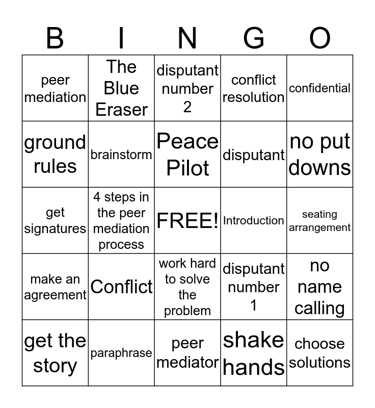 This bingo card has a free space and 24 words: Conflict, paraphrase, Peace Pilot, get the story, confidential, peer mediation, ground rules, The Blue Eraser, Introduction, work hard to solve the problem, disputant, get signatures, disputant number 1, no name calling, brainstorm, shake hands, seating arrangement, disputant number 2, no put downs, 4 steps in the peer mediation process, choose solutions, make an agreement, conflict resolution and peer mediator.