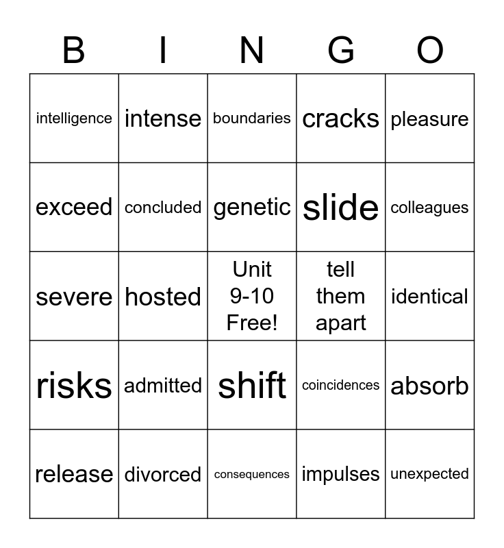 This bingo card has a free space and 34 words: deal with, impulses, clumsy, reward, risks, concluded, pleasure, release, intense, realize/realise, genetic, boundaries, raised, adopted, tell them apart, colleagues, divorced, severe, admitted, coincidences, shift, inference, intelligence, identical, consequences, unexpected, cracks, consented, slide, exceed, wisdom, hosted, absorb and unstoppable.