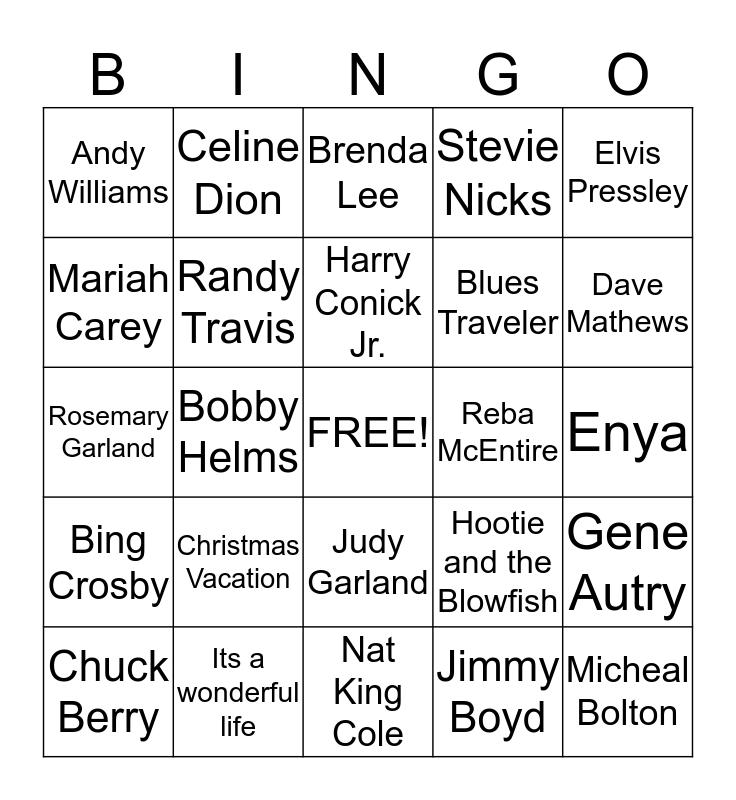 This bingo card has a free space and 24 words: Christmas Vacation, Its a wonderful life, Harry Conick Jr., Chuck Berry, Elvis Pressley, Andy Williams, Mariah Carey, Celine Dion, Reba McEntire, Judy Garland, Blues Traveler, Rosemary Garland, Hootie and the Blowfish, Gene Autry, Randy Travis, Jimmy Boyd, Enya, Brenda Lee, Dave Mathews, Bobby Helms, Micheal Bolton, Bing Crosby, Stevie Nicks and Nat King Cole.