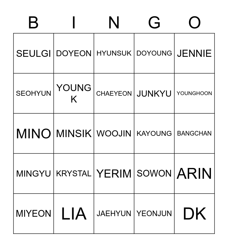 This bingo card has a free space and 24 words: KRYSTAL, LIA, CHAEYEON, MIYEON, JENNIE, SEULGI, SEOHYUN, DOYEON, KAYOUNG, YERIM, JUNKYU, MINO, SOWON, ARIN, YOUNG K, YEONJUN, BANGCHAN, HYUNSUK, YOUNGHOON, MINSIK, DK, MINGYU, DOYOUNG and JAEHYUN.