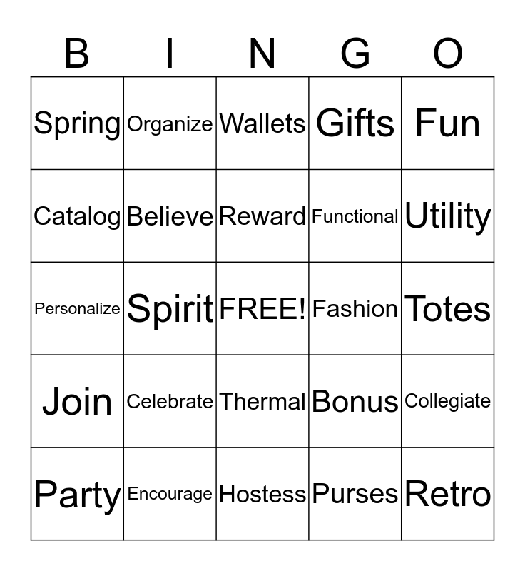 This bingo card has a free space and 24 words: Celebrate, Encourage, Reward, Party, Fun, Spring, Catalog, Organize, Fashion, Thermal, Functional, Personalize, Bonus, Collegiate, Believe, Purses, Totes, Wallets, Utility, Spirit, Retro, Join, Gifts and Hostess.