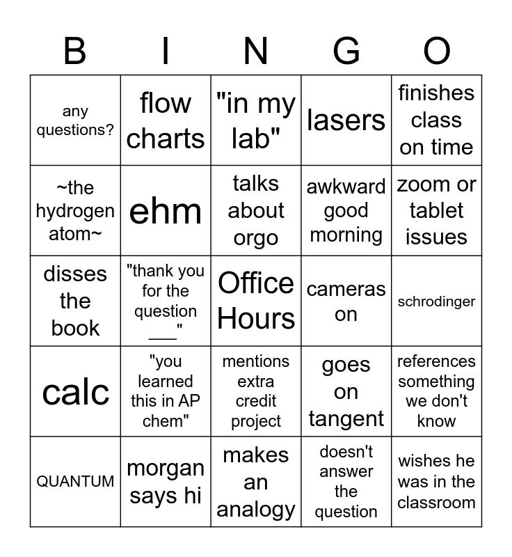 This bingo card has a free space and 24 words: "you learned this in AP chem", morgan says hi, talks about orgo, QUANTUM, finishes class on time, any questions?, ~the hydrogen atom~, flow charts, cameras on, mentions extra credit project, awkward good morning, disses the book, goes on tangent, references something we don't know, ehm, doesn't answer the question, schrodinger, "in my lab", zoom or tablet issues, "thank you for the question ___", wishes he was in the classroom, calc, lasers and makes an analogy.