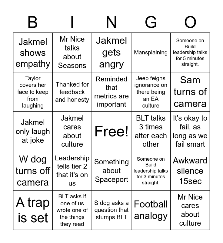This bingo card has a free space and 28 words: Awkward silence 15sec, Jeep says no issues on gray, Jeep feigns ignorance on there being an EA culture, Football analogy, Taylor covers her face to keep from laughing, Jakmel gets angry, Mr Nice talks about Seasons, W dog turns off camera, BLT talks 3 times after each other, A trap is set, Jakmel only laugh at joke, Mansplaining, BLT asks if one of us wrote one of the things they read, S dog asks a question that stumps BLT, Sam turns of camera, Jakmel talks about his boat, Leadership tells tier 2 that it's on us, Thanked for feedback and honesty, Reminded that metrics are important, Something about Spaceport, Jakmel shows empathy, Awkward silence 30sec, Mr Nice cares about culture, Jakmel cares about culture, It's okay to fail, as long as we fail smart, Someone on Build leadership talks for 3 minutes straight., Someone on Build leadership talks for 5 minutes straight. and Someone on Build leadership talks for 8 minutes straight..