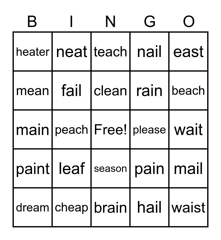 This bingo card has a free space and 24 words: leaf, cheap, clean, dream, east, heater, mean, neat, please, season, rain, main, pain, mail, fail, hail, wait, teach, beach, peach, waist, paint, nail and brain.