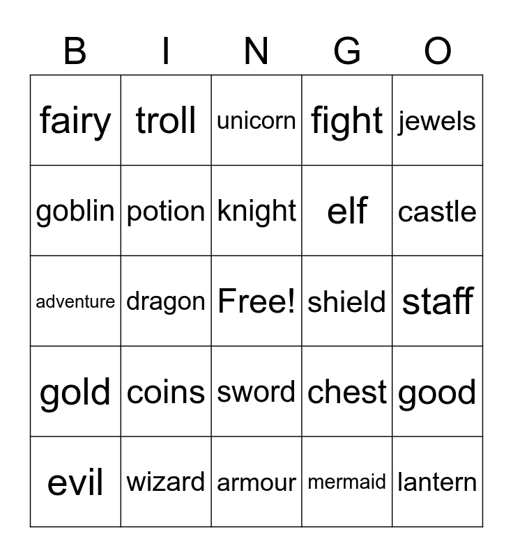 This bingo card has a free space and 30 words: wizard, wand, dragon, magic, fairy, unicorn, potion, sword, shield, armour, staff, lantern, mermaid, monster, castle, treasure, chest, gold, coins, jewels, adventure, quest, troll, elf, goblin, fight, good, evil, knight and curse.