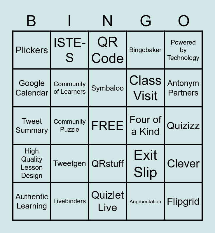 This bingo card has a free space and 34 words: Substitution, Augmentation, Modification, Redefinition, High Quality Lesson Design, Community of Learners, Powered by Technology, Authentic Learning, ISTE-S, Padlet, Symbaloo, QR Code, Google Drive, Mentimeter, Four of a Kind, Antonym Partners, Livebinders, Tweet Summary, Tweetgen, Exit Slip, QRstuff, Kahoot, Plickers, Quizizz, Quizlet Live, Flipgrid, Bingobaker, Collaboration, Class Visit, Google Calendar, Just Like Me, Community Puzzle, Clever and TeacherMade.