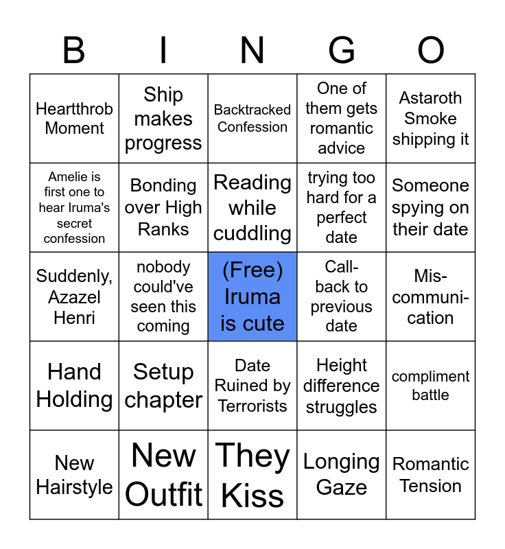 This bingo card has a free space and 34 words: Opera, Longing Gaze, First Love Memory's echoes the chapter, Ship stalls, Hand Holding, Bonding over High Ranks, Astaroth Smoke shipping it, New Hairstyle, Ship makes progress, Ship sinks, Reading while cuddling, Backtracked Confession, Start of an Arc, Human / Demon relations angst, Call- back to previous date, Someone spying on their date, New Outfit, Suddenly, Azazel Henri, Setup chapter, Height difference struggles, Date Ruined by Terrorists, Lilith's Red Carpet Reference, Heartthrob Moment, Mis-communi-cation, They Kiss, Romantic Tension, One of them gets romantic advice, cute food sharing, trying too hard for a perfect date, Amelie is first one to hear Iruma's secret confession, kinda not sorta dating, nobody could've seen this coming, compliment battle and two-page spread of.