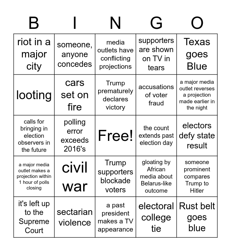 This bingo card has a free space and 24 words: civil war, sectarian violence, Trump prematurely declares victory, it's left up to the Supreme Court, Texas goes Blue, riot in a major city, looting, someone, anyone concedes, the count extends past election day, Trump supporters blockade voters, accusations of voter fraud, calls for bringing in election observers in the future, gloating by African media about Belarus-like outcome, someone prominent compares Trump to Hitler, cars set on fire, electoral college tie, electors defy state result, media outlets have conflicting projections, a major media outlet reverses a projection made earlier in the night, polling error exceeds 2016's, Rust belt goes blue, a major media outlet makes a projection within 1 hour of polls closing, supporters are shown on TV in tears and a past president makes a TV appearance.