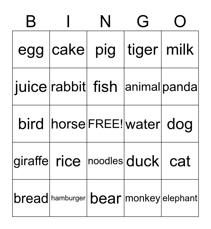 This bingo card has a free space and 24 words: rice, hamburger, fish, bread, milk, egg, juice, cake, water, noodles, animal, bird, duck, cat, rabbit, monkey, dog, pig, panda, horse, elephant, giraffe, tiger and bear.