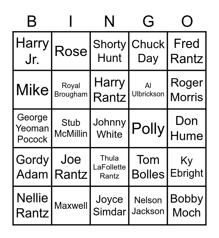 This bingo card has 25 words: Joe Rantz, Joyce Simdar, Harry Rantz, Nellie Rantz, Fred Rantz, Harry Jr., Mike, Rose, Polly, Thula LaFollette Rantz, Al Ulbrickson, George Yeoman Pocock, Tom Bolles, Ky Ebright, Royal Brougham, Bobby Moch, Don Hume, Shorty Hunt, Roger Morris, Stub McMillin, Johnny White, Maxwell, Gordy Adam, Chuck Day and Nelson Jackson.