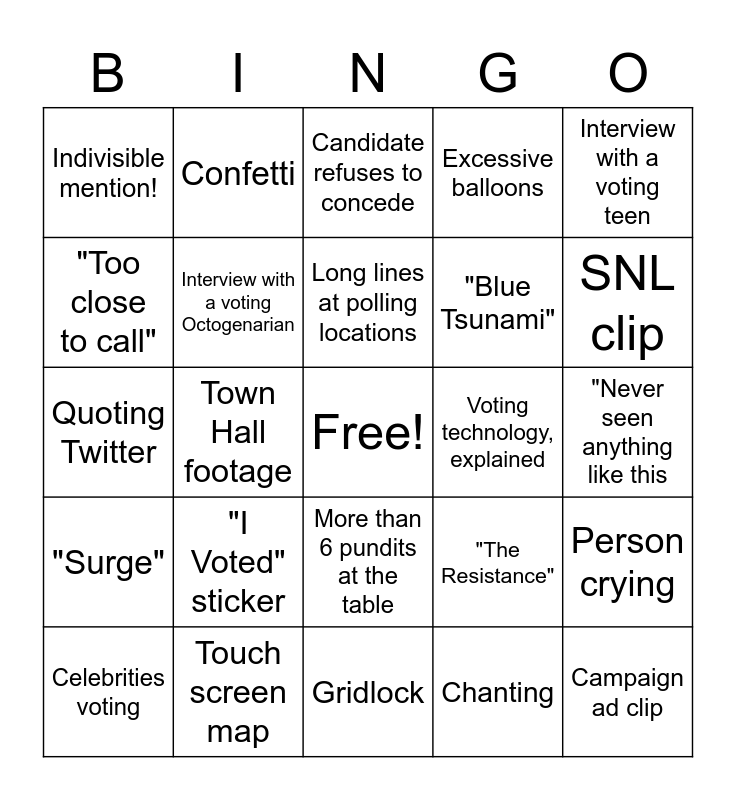 This bingo card has a free space and 24 words: "I Voted" sticker, Touch screen map, Long lines at polling locations, Celebrities voting, Interview with a voting teen, Indivisible mention!, "Too close to call", Confetti, Voting technology, explained, More than 6 pundits at the table, "Blue Tsunami", Quoting Twitter, "The Resistance", Person crying, Interview with a voting Octogenarian, Chanting, "Never seen anything like this, Candidate refuses to concede, SNL clip, Town Hall footage, Campaign ad clip, "Surge", Excessive balloons and Gridlock.