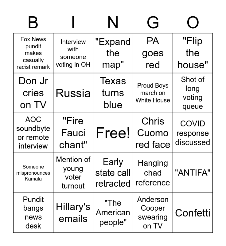 This bingo card has a free space and 24 words: Mention of young voter turnout, Hillary's emails, Texas turns blue, Pundit bangs news desk, "Flip the house", Fox News pundit makes casually racist remark, Don Jr cries on TV, Interview with someone voting in OH, Chris Cuomo red face, Early state call retracted, Proud Boys march on White House, AOC soundbyte or remote interview, Hanging chad reference, "ANTIFA", Russia, Anderson Cooper swearing on TV, COVID response discussed, "Expand the map", Shot of long voting queue, "Fire Fauci chant", Confetti, Someone mispronounces Kamala, PA goes red and "The American people".