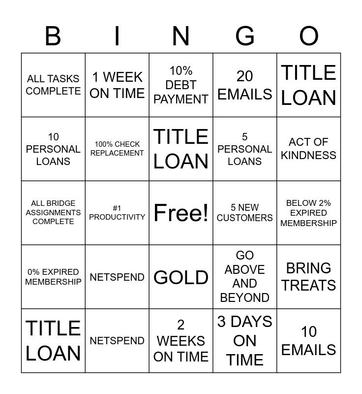 This bingo card has a free space and 24 words: NETSPEND, NETSPEND, TITLE LOAN, TITLE LOAN, TITLE LOAN, ALL TASKS COMPLETE, 10 PERSONAL LOANS, 1 WEEK ON TIME, 5 NEW CUSTOMERS, GOLD, 5 PERSONAL LOANS, ALL BRIDGE ASSIGNMENTS COMPLETE, GO ABOVE AND BEYOND, BRING TREATS, 100% CHECK REPLACEMENT, 3 DAYS ON TIME, BELOW 2% EXPIRED MEMBERSHIP, 10% DEBT PAYMENT, ACT OF KINDNESS, #1 PRODUCTIVITY, 10 EMAILS, 0% EXPIRED MEMBERSHIP, 20 EMAILS and 2 WEEKS ON TIME.