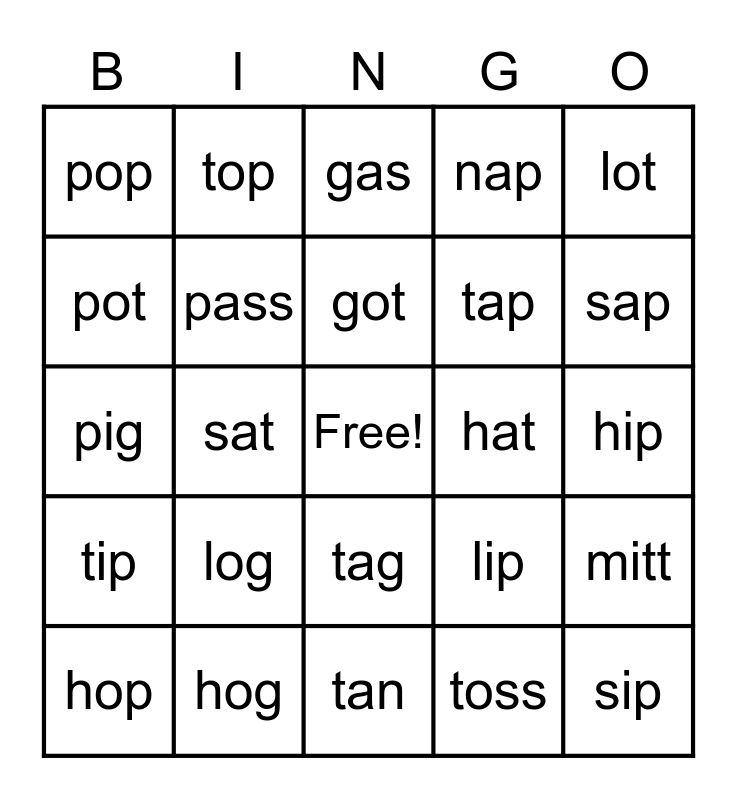 This bingo card has a free space and 24 words: log, hog, got, hop, lot, pop, pot, top, hat, tag, tap, pig, lip, mitt, pass, toss, hip, gas, sap, sat, sip, tip, nap and tan.