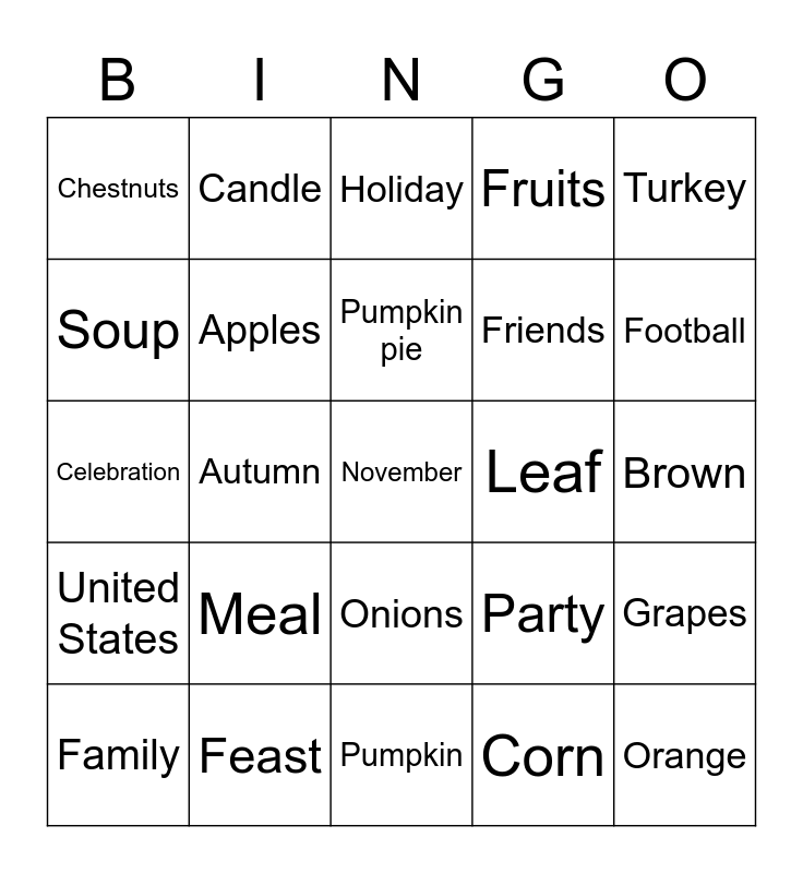 This bingo card has 25 words: Meal, Pumpkin, Pumpkin pie, Family, Turkey, Chestnuts, Soup, Candle, Leaf, Onions, Friends, Celebration, Party, Grapes, Apples, Orange, Brown, Holiday, Football, Autumn, November, Feast, United States, Fruits and Corn.