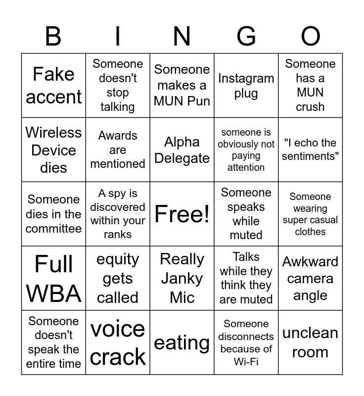 This bingo card has a free space and 24 words: equity gets called, voice crack, Alpha Delegate, Someone doesn't speak the entire time, Someone has a MUN crush, Fake accent, Wireless Device dies, Someone doesn't stop talking, Someone speaks while muted, Really Janky Mic, someone is obviously not paying attention, Someone dies in the committee, Talks while they think they are muted, Awkward camera angle, Awards are mentioned, Someone disconnects because of Wi-Fi, Someone wearing super casual clothes, Someone makes a MUN Pun, "I echo the sentiments", A spy is discovered within your ranks, unclean room, Full WBA, Instagram plug and eating.
