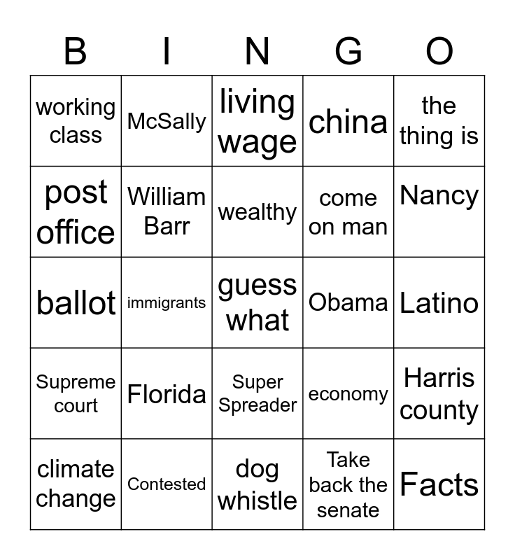 This bingo card has 55 words: mask, climate change, scranton, working class, dog whistle, here’s the thing, William Barr, no joke, come on man, russia, china, covid/corona, Free!, healthcare access, Magic Board, dignity, the thing is, immigrants, virus, guess what, Obama, ACA, economy, living wage, taxes, wealthy, Take back the senate, Black women, Latino, Harris county, Arizona, Voter suppression, Lawful vote, militia, post office, ballot, Riots, Supreme court, Facts, Flipped, McSally, Blue Wave, Bush/Gore, Popular vote, Florida, Contested, Statehood, Electoral college, Lincoln, Nancy, Fact check, Criminal, California, Super Spreader and Early.