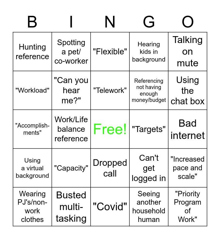 This bingo card has a free space and 24 words: "Capacity", Busted multi-tasking, "Telework", Wearing PJ's/non-work clothes, Talking on mute, Hunting reference, "Workload", Spotting a pet/ co-worker, "Targets", Dropped call, Referencing not having enough money/budget, "Accomplish-ments", Can't get logged in, "Increased pace and scale", "Can you hear me?", Seeing another household human, Bad internet, "Flexible", Using the chat box, Work/Life balance reference, "Priority Program of Work", Using a virtual background, Hearing kids in background and "Covid".