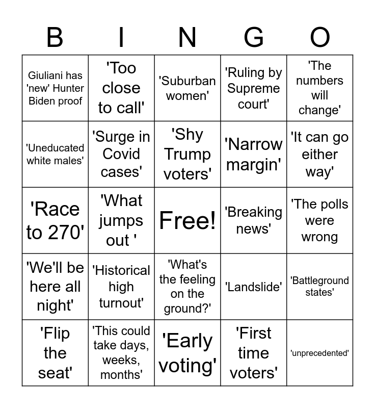 This bingo card has a free space and 24 words: 'Flip the seat', 'Historical high turnout', 'Shy Trump voters', 'First time voters', 'The numbers will change', Giuliani has 'new' Hunter Biden proof, 'Too close to call', 'Suburban women', 'Breaking news', 'The polls were wrong, 'Race to 270', 'Surge in Covid cases', 'Landslide', 'Battleground states', 'Uneducated white males', 'This could take days, weeks, months', 'Early voting', 'Ruling by Supreme court', 'It can go either way', 'We'll be here all night', 'What jumps out ', 'What's the feeling on the ground?', 'Narrow margin' and 'unprecedented'.