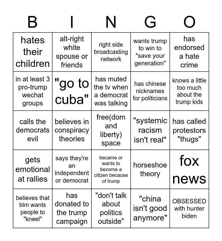 This bingo card has a free space and 24 words: says they're an independent or democrat, has donated to the trump campaign, has muted the tv when a democrat was talking, believes that blm wants people to "kneel", has endorsed a hate crime, hates their children, in at least 3 pro-trump wechat groups, alt-right white spouse or friends, "systemic racism isn't real", became or wants to become a citizen because of trump, has chinese nicknames for politicians, calls the democrats evil, horseshoe theory, fox news, "go to cuba", "china isn't good anymore", has called protestors "thugs", right side broadcasting network, knows a little too much about the trump kids, believes in conspiracy theories, OBSESSED with hunter biden, gets emotional at rallies, wants trump to win to "save your generation" and "don't talk about politics outside".