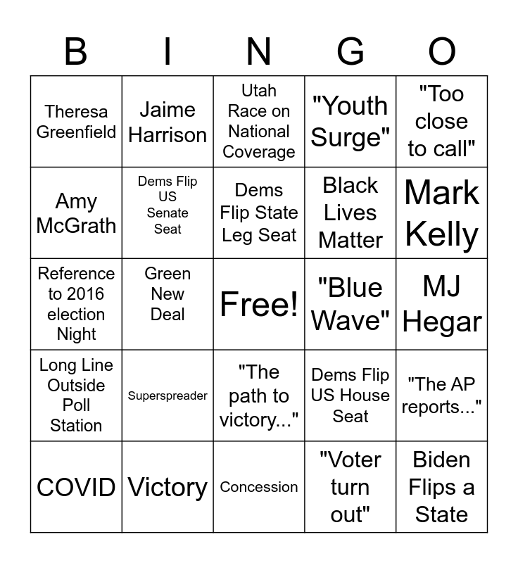 This bingo card has a free space and 25 words: Superspreader, Concession, Dems Flip State Leg Seat, COVID, "Too close to call", Theresa Greenfield, Amy McGrath, Jaime Harrison, "Blue Wave", "The path to victory...", Black Lives Matter, Reference to 2016 election Night, Dems Flip US House Seat, "The AP reports...", Dems Flip US Senate Seat, Ben McAdams, MJ Hegar, Utah Race on National Coverage, Mark Kelly, Green New Deal, Biden Flips a State, Victory, Long Line Outside Poll Station, "Youth Surge" and "Voter turn out".