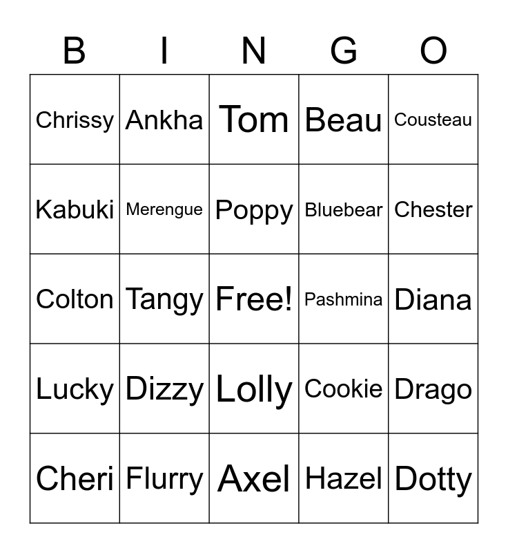 This bingo card has a free space and 71 words: Agnes, Ankha, Apollo, Aurora, Axel, Bam, Beau, Biskit, Bluebear, Bob, Cheri, Cherry, Chester, Chrissy, Coco, Colton, Cookie, Cousteau, Daisy, Diana, Dizzy, Dotty, Drago, Erik, Eugene, Eunice, Fauna, Filbert, Flo, Flora, Flurry, Francine, Fuchsia, Genji, Hazel, Hornsby, Jeremiah, June, Kabuki, Ketchup, Lolly, Lopez, Lucky, Maple, Marina, Marshall, Melba, Merengue, Merry, Mint, Molly, Papi, Pashmina, Pekoe, Pietro, Pompom, Poppy, Purrl, Roald, Shep, Sprinkle, Stitches, Tangy, Tasha, Tia, Teddy, Tom, Wendy, Yuka, Zell and Zucker.