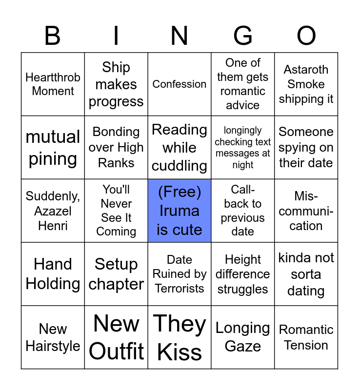 This bingo card has a free space and 34 words: Opera, Longing Gaze, First Love Memory's echoes the chapter, Ship stalls, Hand Holding, Bonding over High Ranks, Astaroth Smoke shipping it, New Hairstyle, Ship makes progress, Ship sinks, Reading while cuddling, Confession, Start of an Arc, Human / Demon relations angst, Call- back to previous date, Someone spying on their date, New Outfit, Suddenly, Azazel Henri, Setup chapter, Height difference struggles, Date Ruined by Terrorists, Lilith's Red Carpet Reference, Heartthrob Moment, Mis-communi-cation, They Kiss, Romantic Tension, One of them gets romantic advice, cute food sharing, longingly checking text messages at night, mutual pining, Amelie is the first one to hear Iruma's human recording, You'll Never See It Coming, kinda not sorta dating and compliment battle.