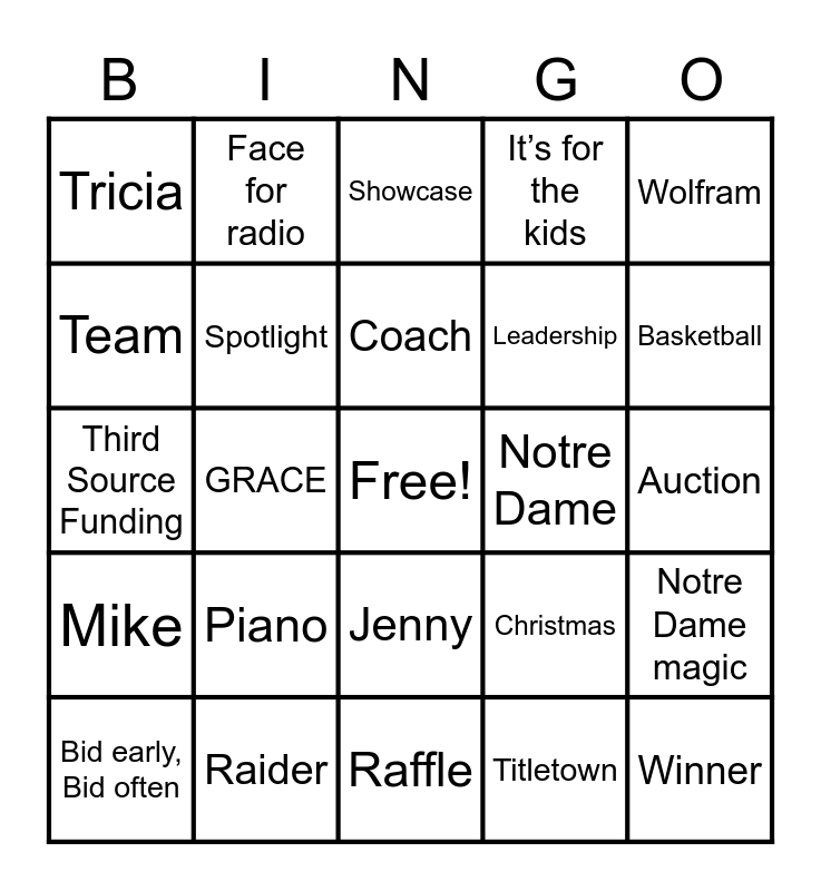 This bingo card has a free space and 29 words: Bid early, Bid often, Bid often, Bid high, GRACE, Mrs. Mares, Tricia, Showcase, Spotlight, Piano, Notre Dame, Raider, Auction, Winner, Raffle, Titletown, Basketball, Facebook, Jenny, Mike, Wolfram, Third Source Funding, Christmas, Tickets, Leadership, Team, It’s for the kids, Face for radio, Notre Dame magic, Coach and Notre Dame royalty.